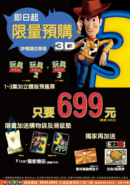 預購3D玩具總動員1到3集活動在哈拉影城開跑囉!699元含1到3集3D電影票、皮克斯購物袋、胡迪滑鼠墊、叢林樂園儲值金150玩、定食8免費兌換券。