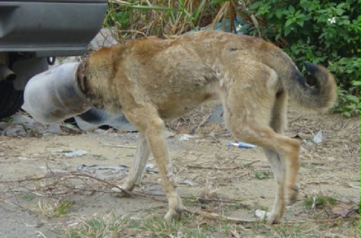 從前有一隻流浪狗,牠因為很多天沒有吃飯,看到別人有剩下來的飯放在油桶,所以就把頭伸進去吃而拔不出來。