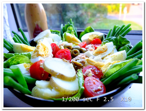 這是我參加Yik為兒子開心舉辦的Farewell Party,從她做的超級豪華版沙拉學來的,馬鈴薯燙軟切片、green beans燙熟、白煮蛋、小蕃茄、橄欖、鮪魚,底部襯美生菜或萵苣即可,最後淋上French light salad dressing,但我嫌酸,以千島醬代替。
