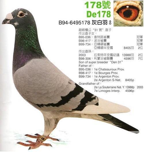 當像「231」 這樣的超級明星退幕之後,人們自然會問起他後代的表現。在萬眾期待的矚目中,環號B94-6495178的「178」閃亮登場,這羽「231」 直子也是一羽灰白條,他是許多省賽和國家賽冠軍的父親和祖父。