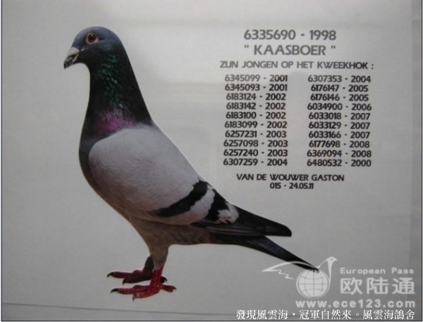 比利時葛斯頓.範德瓦爾(Gaston van de Wouwer)一手打造出令全球鴿界震撼的“乳酪小子”(BE98-6335690)王朝,而這一當家種公也成就了他在比利時大中距離賽場上的霸主地位!