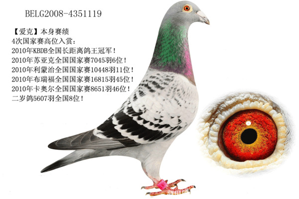 愛克,BELG2008-4351119雨點 黃 雄,克裡斯赫伯瑞原舍,4次國家賽高位入賞,2010年KBDB全國長距離鴿王冠軍,兩大國際頂尖長距離冠軍血統的完美融合+兩位國際頂級長距離賽鴿大師友誼的見證!現藏於唐山開爾鴿業。