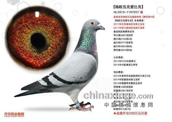 血統出自楊歐瓦克基礎種鴿“佛巴斯46”,此鴿是荷蘭楊歐瓦克先生極力推薦給開爾鴿業集團邢偉先生的世界級種鴿,鴿主布倫斯·提奧&摩亞姆和楊歐瓦克先生是近50年的老朋友,開爾不惜重金引進。