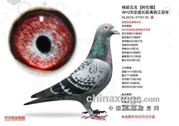 血統出自楊歐瓦克基礎種鴿“佛巴斯46”,本身WHZB全國長距離鴿王冠軍,是一羽“佛巴斯46”極度近親種雄(祖母、外祖母都是同一羽楊歐瓦克“佛巴斯46”基礎種鴿)。此鴿是楊歐瓦克先生親自上手鑒定的一羽超級賽鴿,鴿主維塞爾·雷多普是楊歐瓦克先生老朋友的兒子。