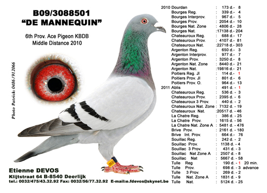 現在要談的是著名的「 MANNEQUIN 3088504/09 」,牠的重要翔績:亞精頓19816羽全國21位、夏特盧20517羽全國46位、圖利5124羽全國25位、蘇亞克5667羽全國58位,也就是說4次進入全國前 100位。此外,牠還獲得布利福2161羽全省180位、拉沙特1615羽全省56位、夏特盧4107羽全省81位、布治4806羽全省10位,還分獲波提葉及艾碧利斯兩個中距離賽冠軍。