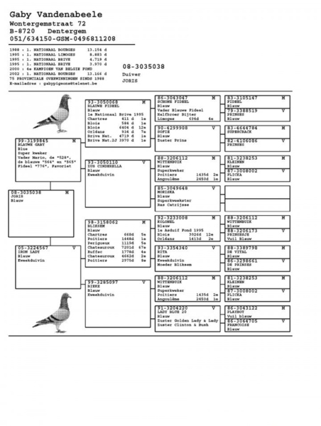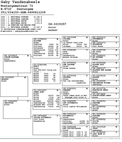 毫無疑問,蓋比在布瑞福國家賽上的表現,相當令人驚慕!他在7分鐘的時間內,有5羽獎鴿歸巢打鐘。事實上,有4羽鴿子是在1分鐘之內打的鐘。他的首羽鴿子歸巢時間是17點09分29秒,是一羽成年鴿。6分鐘之後,4羽鴿子在一分鐘之內,全部歸巢,其中1羽成年鴿,3羽一歲鴿,包括第一指定和第二指定一歲鴿。他們的歸巢時間分別是:17:15』 28」, 17:15』 46」, 17:16』 01」 ,以及17:16』 12」。他們花了10個小時10分至15分鐘,飛越了約660公里。在天氣惡劣且有強烈東北逆風的情況下,達到了1100米/分的分速。這是非常令人驚歎的成就!現在,讓我們看看他們的賽績列表: