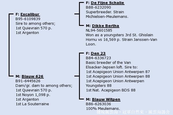 6羽獲安特衛普區鴿王冠軍,2羽奧琳匹亞鴿及1988年BDS國家賽鴿王冠軍奧爾良省賽亞軍,波治國家賽13154羽13位,波治10163羽26位Castor卡薩特"獲安特衛普區中距鴿王冠軍。
