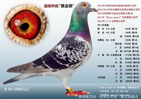 黃金眼,1000322/2009,菲利朋斯派翠克的超級種鴿,本身獲得KBDB長距離(600-800公里)全國鴿王亞軍,2011年“Basse Meuse”長距離鴿王冠軍,2011年LCB國家鴿王冠軍,2012年布達佩斯五洲杯KBDB代表鴿冠軍。