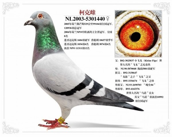 柯克雌不但是勒芒99104羽全國冠軍(120936羽最高分速),也是2004年NPO中距離省鴿王1位、NPO中距離鴿王全國8位,而它的同孵兄弟鴿“所向無敵”(B03-5301441灰♂),正是2005年奧林匹克全距離鴿王及2004年NPO中距離鴿王全國4位,它們的父鴿“小飛戈”(B02-3025837)也因此名揚四海。