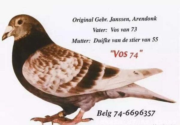 在眾多的賽鴿名系裡,除以人名命名之外,還有很多是以羽色命名的,比如兆尊蒼白、幕利門大紅袍、村松白等,而最早的當屬「詹森紅狐」。「紅狐」(VOS)特指詹森兄弟的紅輪鴿,似乎世界上還沒有其他哪個賽鴿家的某一路血脈有這樣一個響亮的專用名詞。可以說,正是「詹森紅狐」開創了以羽色命名鴿系的鴿界傳奇。