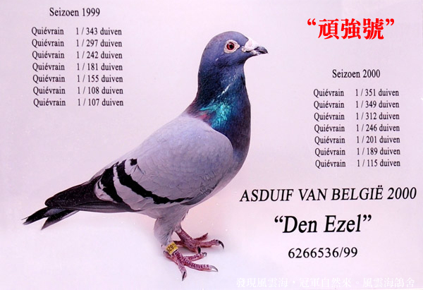而這些年來其下代的優異表現更展現出 “頑強號” (Den Ezel) 不只是一羽的優秀的賽鴿而已,更是一羽不可多得的好種鴿 ! 因為從2003年至今,“雷尼馬頓” (Mertens Rene) 用其下代參與各大小比賽至今,最少已獲得超過80次的冠軍頭銜 ! 其成績代表如下: