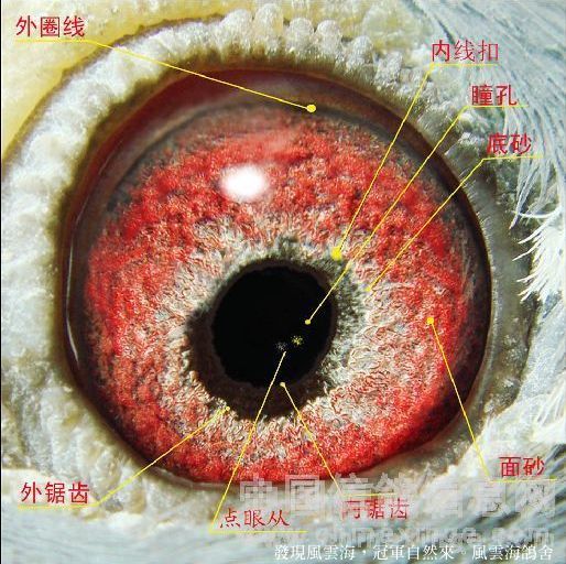 信鴿眼睛是信鴿視物器官,在信鴿覓食尋路等方面有其他器官不可替代的重大作用,故鴿友「一鴿在手,首觀其眼」已是不爭的事實。鴿眼是一個龐大的系統工程,到目前為止,尚未有人攻破這一理論難題,其深奧之處讓人難以捉摸。現就多年對鴿眼結構的觀察,簡單分析一下其大體結構,皮毛拙見,如有不妥還望同仁指教。 鴿眼結構,從直觀上看大體可分為七個方面,從內往外看,一是瞳孔(又稱瞳仁),二是內線口(又稱磁圈、內圈或品性圈),三是眼志(又稱眼臍),四是底砂(又稱內虹彩),五是面砂(又稱外虹彩),六是眼緣線,七是外封砂。