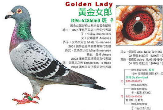 「黃金女郎」的父親是比利時四次冠軍,1996年全國中距離鴿王一位,超級賽鴿「所向無敵」,它的親兄弟「波治」也有不俗的成績,省波治賽6761羽冠軍,全國40401羽比賽亞軍。「所向無敵」的父親是安特衛普省三次冠軍,傳奇的「蘭博」,「黃金女郎」的母親是「蘭博」的親姐妹。所以「黃金女郎」是侄子和姑姑的混血之作,繼承了非凡血統的「黃金女郎」同樣為自己的子女們提供了非凡的能力。
