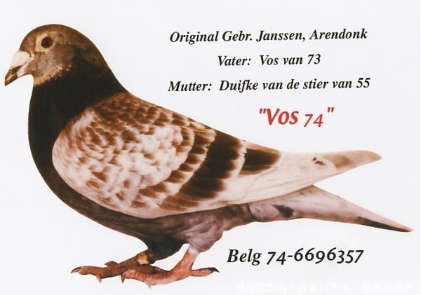 紅狐74出自詹森本舍,是詹森名鴿紅狐73和斯帝爾55孫女所生,是理奇捨中頭號種雄,著名的奇跡號80-533,76-781,85-815,國際紅公,86-100,90-400都是他的後代。