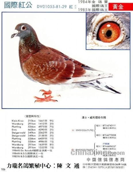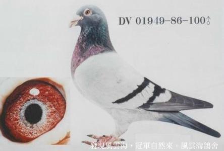 大名鴿100號,DV01949-86-100:它是紅狐74的4代,也是國際紅公的直子。曾獲冠軍1次,亞軍1次,2次4名,2次5名,聯合會鴿王。