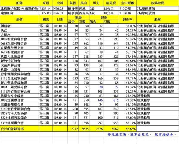20190414 108年春季北海第二關出海210公里歸返率成績資料