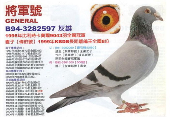 將軍號,B94-3282597,喬治波裡基礎種鴿,獲得1996年比利時卡奧爾國家賽9043羽冠軍。