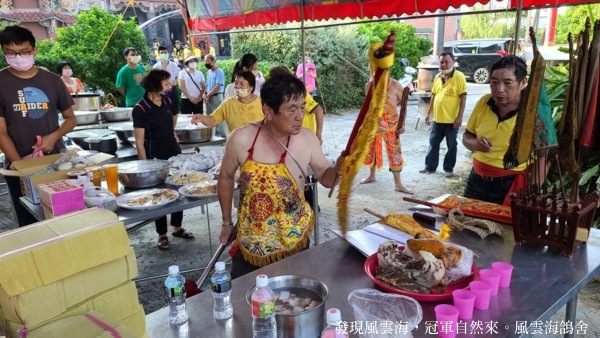 當日下午15:30開始家家戶戶會準備飯菜、三牲、金紙等貢品前往宮前犒賞五營將軍兵將,表達感謝之意。