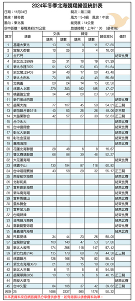 20241125冬季北海聯合船隊第二關基隆港出海210公里歸返率成績資料
