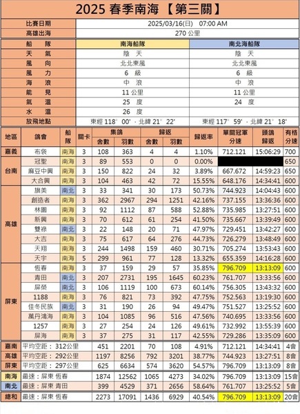 20250317春季南海南北船隊第三關高雄港出海270公里歸返率成績資料