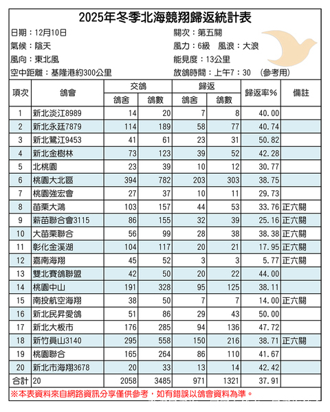 20251210冬季北海船隊一週二關制第五關基隆港出海300公里歸返率成績資料