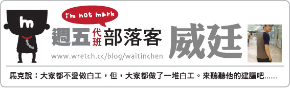 這次邀他為我代班,他為了鼓勵大家發言,居然願意自掏腰包買我三個馬克杯送給網友,感動之餘,我也特別提前將我之前所繪製的『做白工』插圖製作成馬克杯,供他這次使用。所以快將你吐血做白工的經驗留在這一篇的回應裡,威廷會在下週四選出三位得獎者,我會於下週五公佈!把握機會吧,來看圖文還有好康可拿,有沒有為這個週五再增添些快樂啊! ^_^