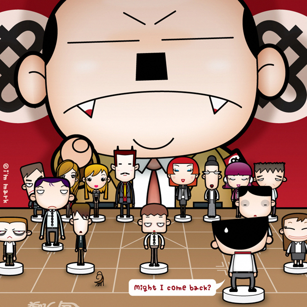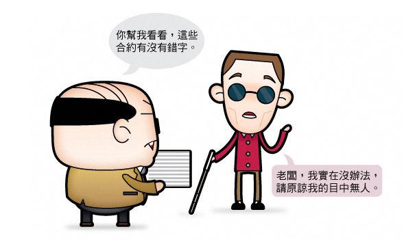老闆的表情其實是一臉驚慌又故做鎮定的樣子。他是老闆耶,老闆要有威嚴的耶,憲法還規定老闆可以不用認錯耶,上班時間總不能叫他罰三杯吧?