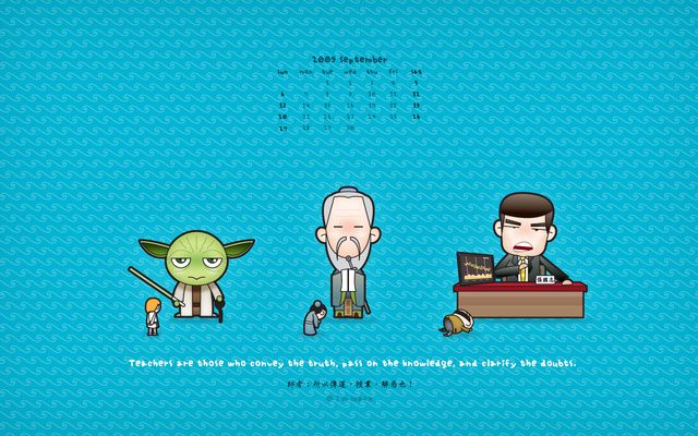 其實是我給忙忘了,本來昨天就該公佈的九月桌布今天才露臉,這次的主題是為了偉大的老師們。兒時心中的老師總是侷限在校園中,但長大後發現並不是如此,各種領域都能產生出讓人印象深刻的老師。這個月托孔老夫子的福,有一天專屬於你們的節日,祝全天下的老師們,教師節快樂!