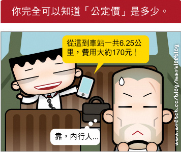 無論在什麼地區,只要預先值入該地計程車費率算法,你就能利用智慧手機中的地圖軟體工具,計算你乘坐計程車的:A.規畫路線、道路 B.預計時間 C.顯示估計計程車費用 D.規畫其他公共交通工具的規畫路線~~是不是超好用的發明啊!如此一來︰