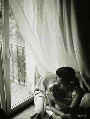 雨點敲打着玻璃窗.聚集成串,順着窗戶不斷往下流.窗前,正站着