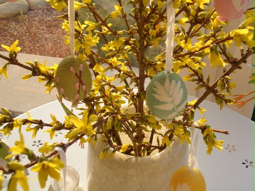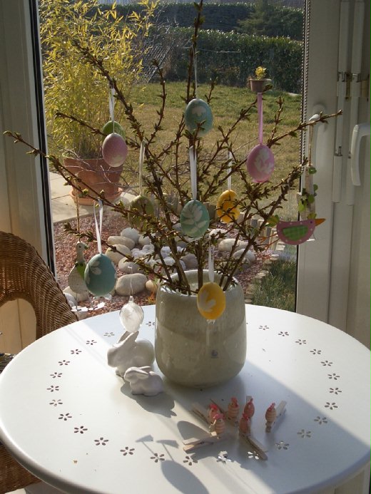 復活節一接近 ' 一些可愛的東西 ' 溫柔的色彩 ' 春天的新生命就會出現 ' 花園的黃花樹修剪下來的樹枝 ' 加上一些彩蛋 ' 就成了蛋蛋樹 ' 這是瑞士一般的習俗 ' 復活節的裝飾 '