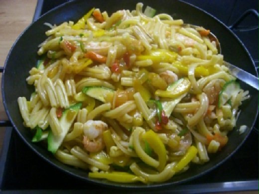 煮義大利麵 ' 我的經驗是最好根據包裝上的時間為標準 ' 煮出來的軟硬最合適 ' 如果還要放入備好的醬汁裡拌上一些時候的話 ' 則水煮時間就要縮短一分鐘 ' 醬汁的口味 ' 其實可以自創 ' 不喜歡按牌理出牌的我 ' 就常常搞一些意外的驚奇 ' 就像這次 ~ 我用鮮蝦 ' 洋蔥 ' 福壽瓜 ' 甜椒 ' 一根綠辣椒 ' 鳳梨 ' 加上酸甜醬 ! 很特別吧 ! ( 喔 ! 起鍋前 ' 我又淋上一些萬家香醬油 ! )