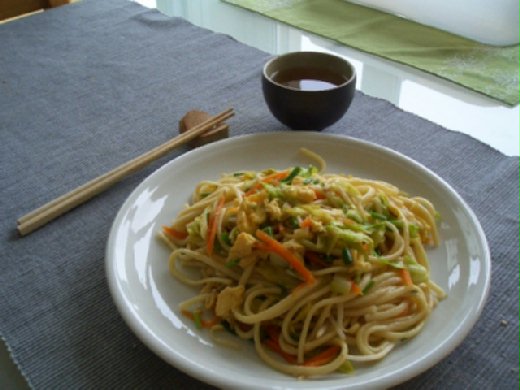 日本的手打烏龍很香Q ' 我用自己喜歡的口味來拌炒 ' 加入很多高麗菜 ' 紅蘿蔔絲 ' 最後丟入豆芽菜 ' 炒好的混蛋跟香蔥 ' 對不喜歡肉的人 ' 應該會很對味 ' 調醬則換成日式的燒肉醬 '