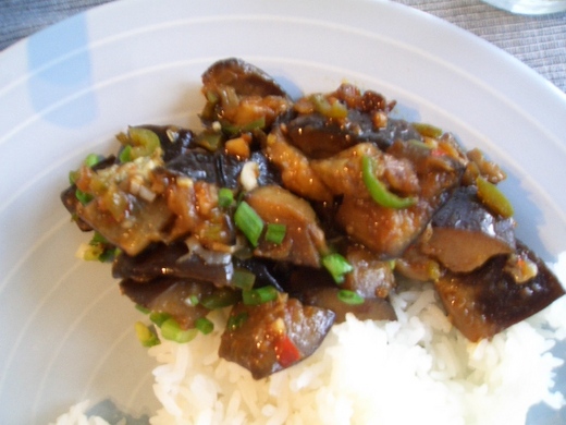 細心將茄子用油煮得熟透 ' 再加入大蒜爆香 ' 最後淋上醬油 ' 專心聽那ㄘ ~ 的聲響 ' 點綴香菜 ' 青蔥跟新鮮的青辣椒 '