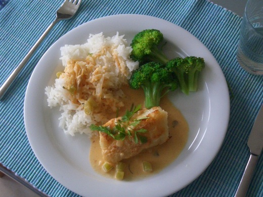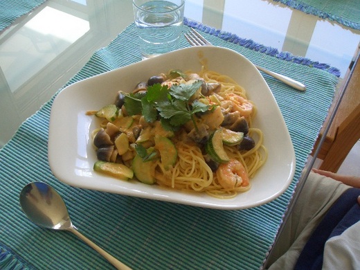 這次我做的是椰汁紅咖哩淋醬配鱈魚排 ( 魚排沾粉煎成金黃色 ) ' 剩下的儲存起來 ' 過兩天則當做龍蝦義大利麵的醬汁 '