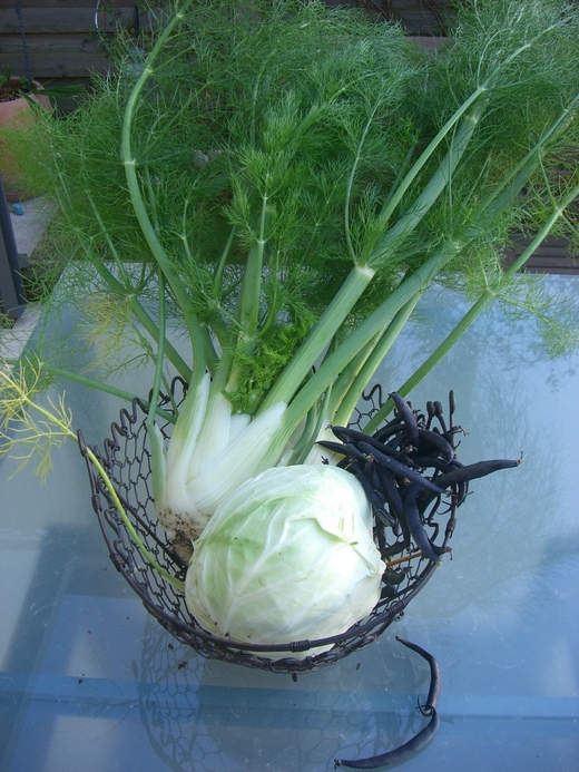 今天我終於有了力氣 ' 開始清洗窗戶 ' 先洗東邊跟西邊的落地窗 ' 南邊的等巴黎回來後再說吧 ! 皮耶看到我 ' 提了一桶紫色四季豆過來 ' 然後要我自己去他的菜園裡採收高麗菜跟茴香 ' 我今年的菜園很慘 ' 因為人在台灣 ' 無法照料 ' 所以沒啥東西 ' 體貼的他 ' 每星期固定會送一堆新鮮的蔬菜給我 ' 剛採收的蔬果 ' 隨便做都好吃 ' 自然口味 ' 清香甜美 !
