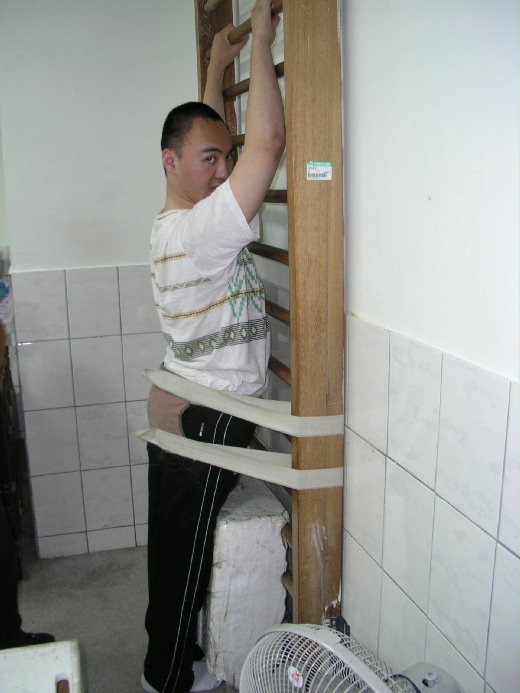 中圖:練習雙手力量的拉推速度的阿仁忍住不受大腦控制的張力說﹁我一定會成功﹂。