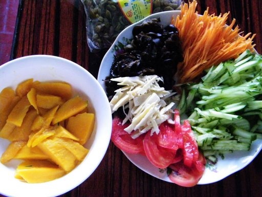 步驟:1.蔬菜們切絲,木耳泡發煮熟切絲,春筍煮熟切絲,番茄切片,芒果切小塊置冰箱;