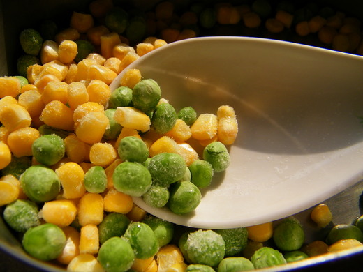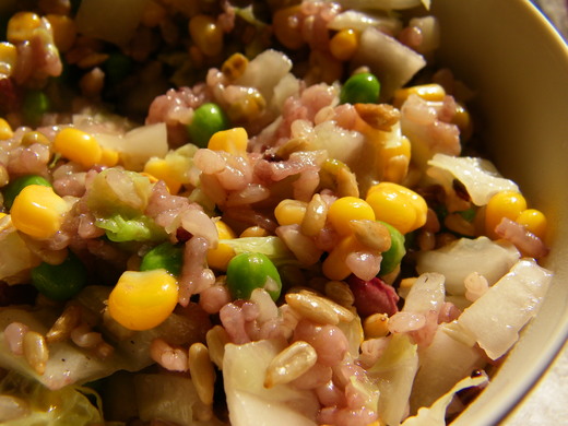 3.少量油將鍋坐熱,依次翻炒青豆、玉米、白菜絲,約2分鐘,最後放隔夜的五穀米,約2分鐘;
