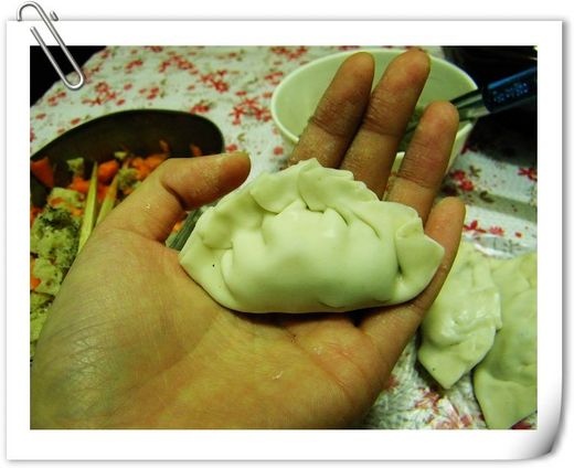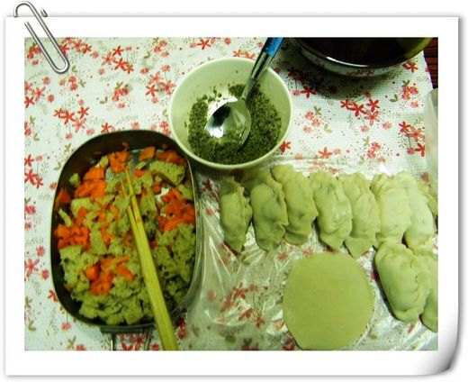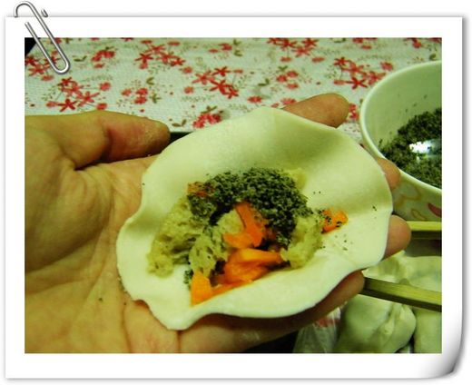 素水餃——內容:烤麩(丁)、胡蘿蔔(細絲)、芝麻核桃粉,和一點香油。