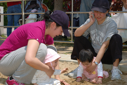 剛坐下去,她很認真的看沙、玩沙,接下來的動作就是--拿起沙往我的褲腳以及鞋子上面抹,一遍又一遍,很順手也很開心的樣子,等她玩夠了,我的鞋子裡也都是沙啦!這後來說給小小媽聽,小小媽覺得小音符是好東西要跟媽媽分享,所以好玩的沙子,也要跟媽媽分享囉!