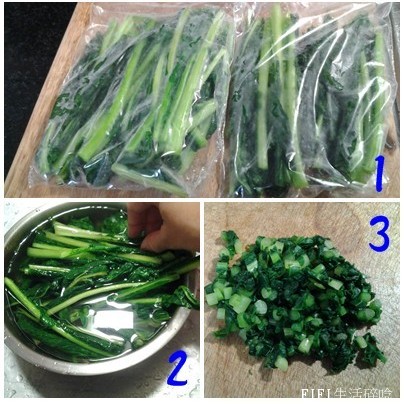 再將蘿蔔葉從夾鏈袋中取出,開流動水將蘿蔔葉的鹽份沖洗一下(才不會太死鹽.....)|PS...因為為了拍照的關係,所以FIFI是放入鍋中沖洗.........(如圖2)再擰乾並切末(如圖3)