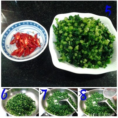 起一熱油鍋,將切末的蘿蔔葉放入鍋中,熱炒並加入些許的水(加水是為了淡化蘿蔔葉裡的鹹度,不要那麼死鹹,並且可以軟化菜葉的硬度增加口感外也可以較快熱熟)(如圖6-8)