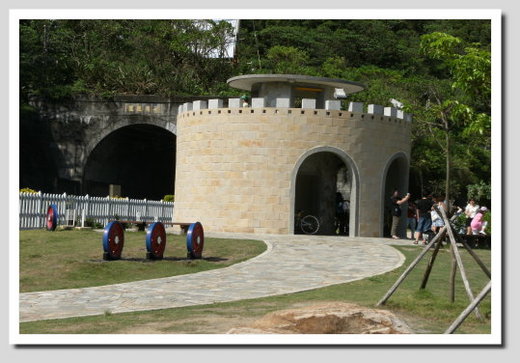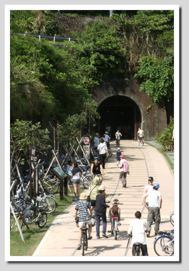 跨上鐵馬,我們朝著山洞騎去。太陽的威力真的很猛烈,不過進到隧道裡卻異常的涼爽舒適。幽暗的洞裡盡是同來覽勝的人們,有闔家齊來的、情侶攜手的、同齡結伴的,有騎單車的、也有走路的,