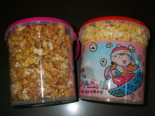 到美國唸書,看到的爆米花就更多啦,很多是裝罐好直接到超市賣,而且焦糖更多,因為要加入不同的堅果,雖然很甜,不過很好吃。這也是我到美國變胖了很多的原因之一,最糟糕的是養成吃飯後甜點的習慣,以致回台灣還是繼續胖下去,唉…