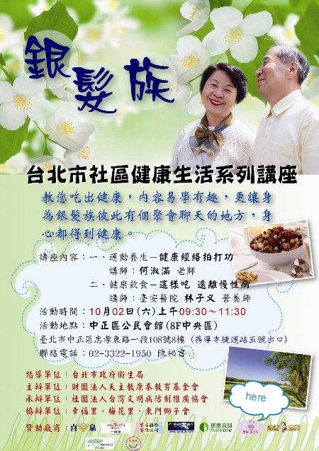 10月2日,應邀贊助了"台灣文明病防制推廣協會"在 中正區公民會館為銀髮族舉辦的健康講座。