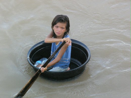 洞里薩湖上賣零碎的船童,為了要比其他孩子更快些划到我身邊好做生意,她的大澡盆好幾次演出特技動作~將翻未翻,(其他爭先恐後的幼幼水軍們都翻船好幾回了,全沒事 ! ) 可見她功夫了得。怪的是最先到的她,卻不急著推銷東西,反而是留在最後出手。原來她是姐姐,連生意都讓弟妹先做。我也增加一個經驗 : 在一片汪洋中買下她全船的貨物~一甁礦泉水。