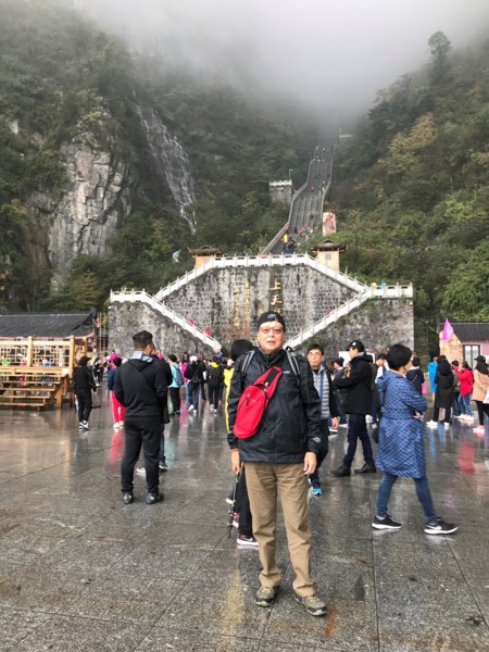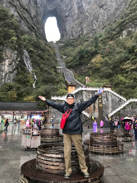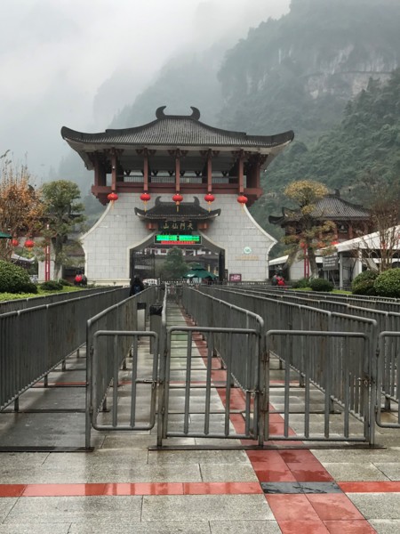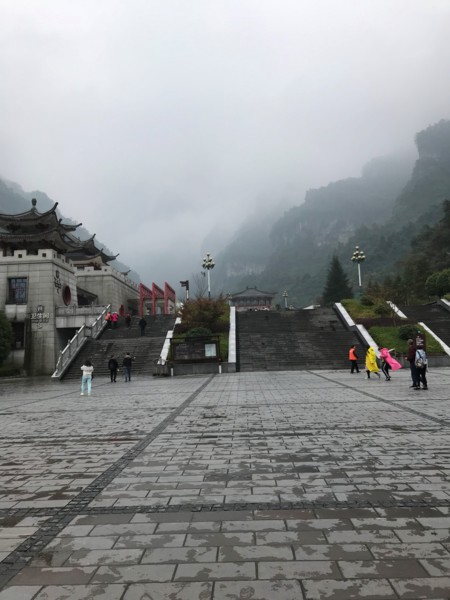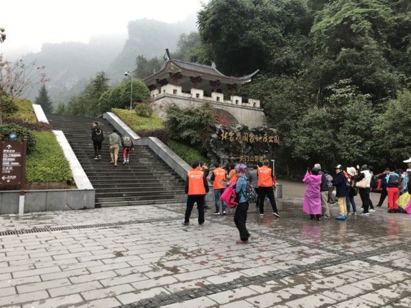 我們造訪 天門山 的2019年11月,天門山索道 因進行檢修維護而未營運。 只好從 山門 搭乘環保車,經由彎彎繞繞的盤山公路,車行約50分鐘,終於來到 天門洞廣場。
