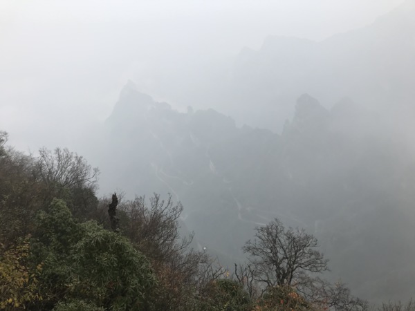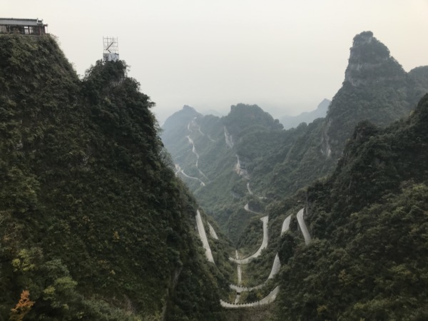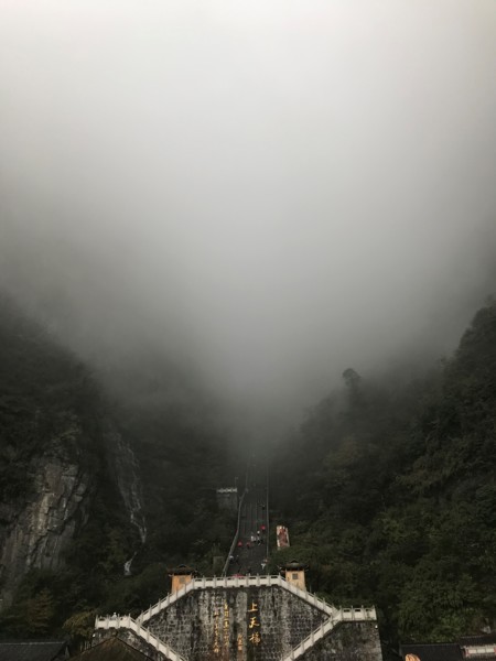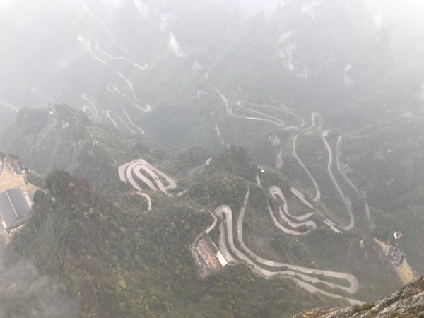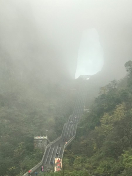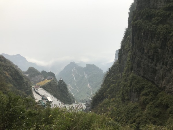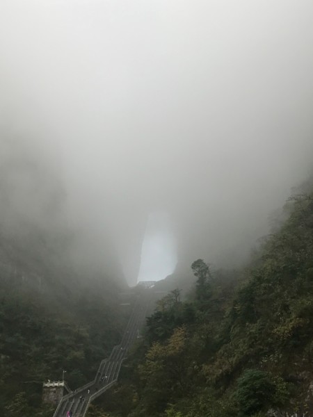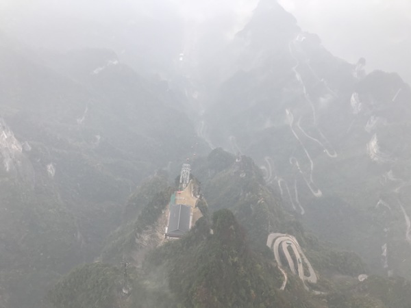 搭乘穿山扶梯回到中間的 天門洞 時,發現雲霧散開了,眼前豁然開朗,盤山公路景觀清晰可見。