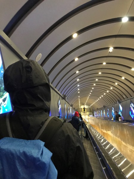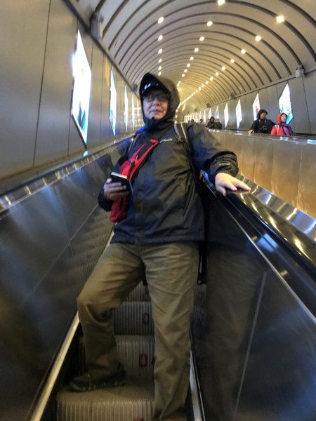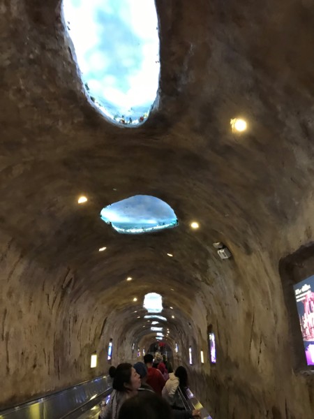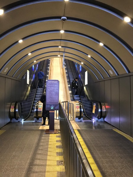 走出電扶梯後,穿過一段人行隧道,走過山壁邊的步道,再搭乘後半段扶梯抵達山頂。